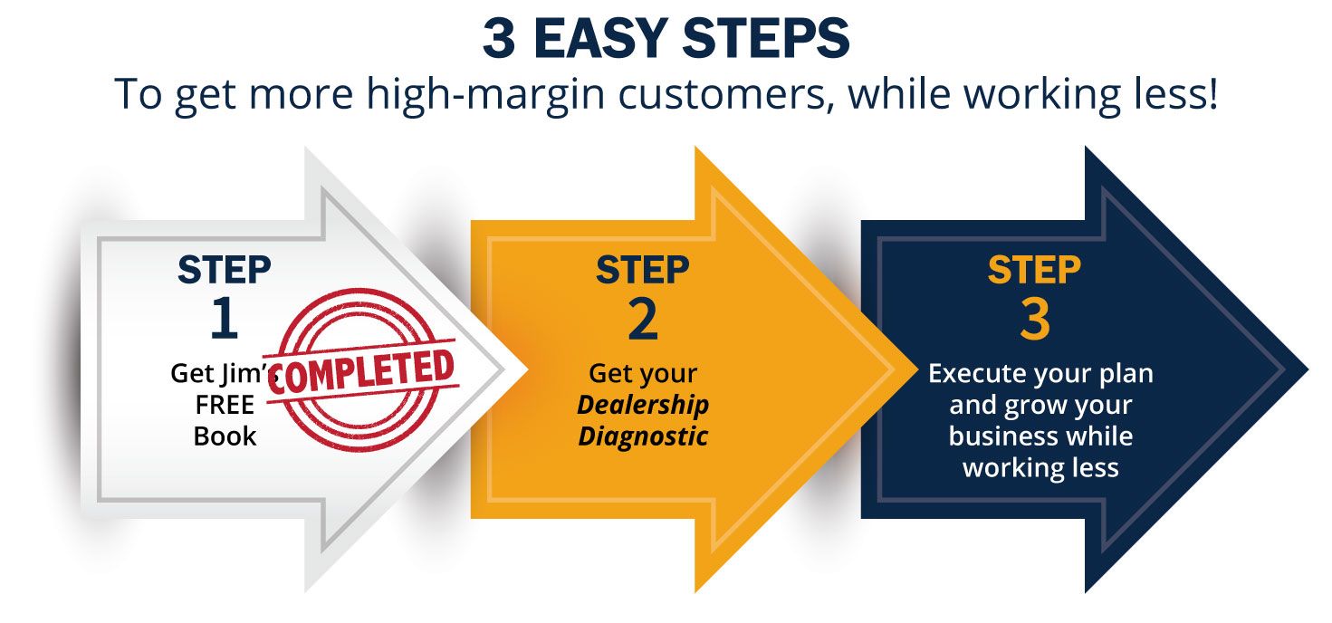 I offer a Dealership Diagnostic for $500, but because you cared enough about your business to order my training materials I’m going to make it available to you for free.   For this diagnostic I’m going to review your market conditions, competitors in your area, population, and median income to help give you a guide for where your dealership should be in terms of revenue and margin.  This way you can determine whether you are on target, falling behind or even ahead of where you should be. I’ll do the analysis and then we’ll get on the phone I’ll do an 18-point review of your business. I’ll give you any easy wins that I see; things you can do right now to get the biggest results fast. And I’ll give you a simple plan to reach your goals.